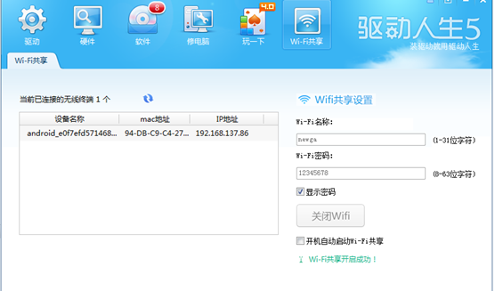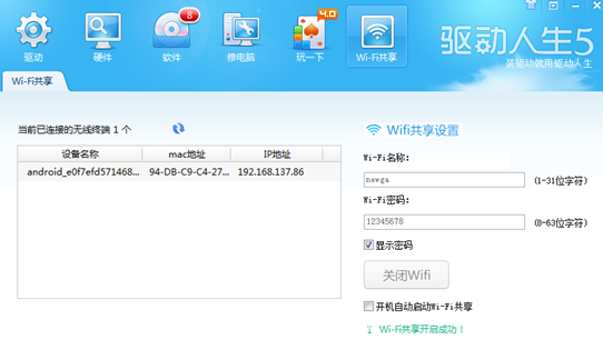 注意事项:驱动人生6去掉了wifi共享模块,将160wifi加入到了工具大全中,开启wifi热点更加的简单了。