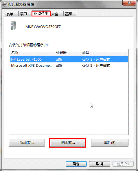 第二步. 单击打印服务器属性--驱动程序--删除,选择删除驱动程序和驱动程序包,点确定;