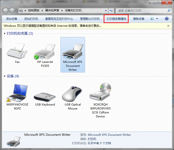 第一步. 开始-设备和打印机:随便选择一个打印机图标,选择打印机服务器属性;