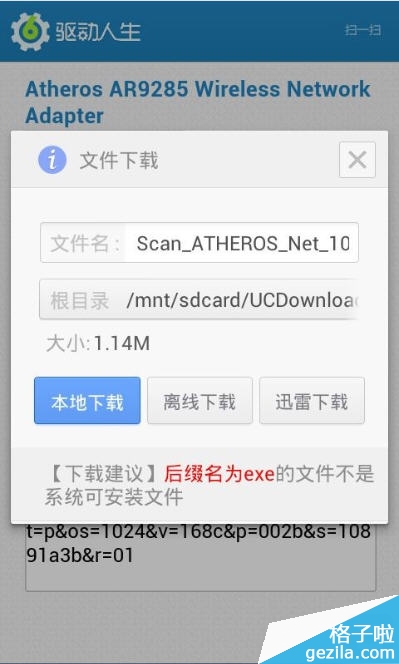扫描完成,识别成功之后,会出现一个驱动人生网卡驱动的下载页面,这个就是网卡驱动了。温馨提示:建议在WIFI环境下下载该网卡驱动,否则运营商可能会收取相关费用。点击下载,选择根目录,再点击本地下载,就可以将网卡驱动安装包下载到手机上了。