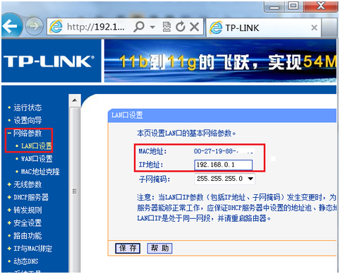 最后,为便于以后登录路由器,有必要确认或更改路由器后台管理IP和DHCP地址池中IP相同网段。选择左边的“网络参数”,再选择“LAN口设置”: