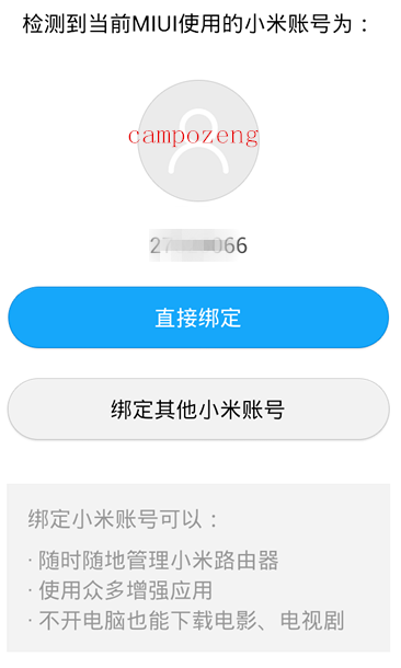 如果你想使用小米路由器的更多云服务,你想把小米路由器设为智能家居的控制中心,那就可绑定一个小米账户了,如下图