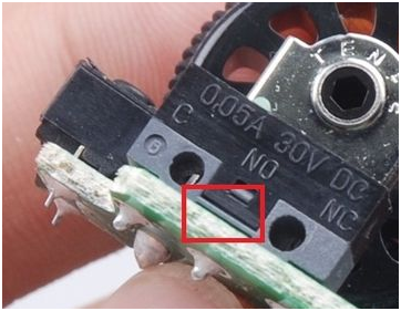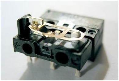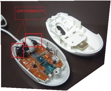 2、鼠标按键位置的两个元件就是鼠标微动开关,如图,接下来拆开这个进行修理,拆下来的时候要非常小心,非常容易变形,到时候手感就不好了。