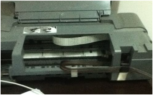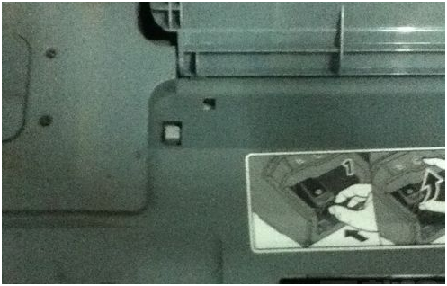6、如何验证呢,如图所示有一个按钮,打开打印机盖之后墨盒会到最左边。按下(一直按住)这个按钮打印机的墨盒会回到最右边。根据自己观察让打印机的布线不留多余长度的线最好。