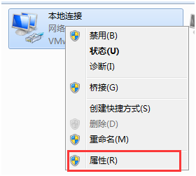 接着我们在本地连接上单击右键,点击“属性”,这一步是为了共享网络,如下图所示: