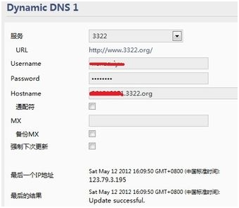 看到右边的Dynamic DNS 1设置,“服务”一栏选择自己所申请的动态域名的提供商(以3322为例),“Username”填自己在动态域名网站所申请的账户的登录名,“Password”则是填相应的登陆密码,“Hostname”则是填自己所申请到的动态域名。填好只好点击页面最下方的“Save”。
