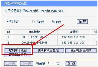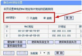 打开左边“ip与mac绑定”选项卡。并且启用ARP绑定。