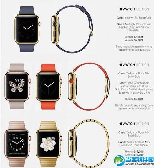 最后,几天的重点 Apple Wathc Edition 系列以 6 款优雅独到的风格演绎了 Apple Watch 的非凡魅力。每个表款均配备由冶金大师精心打造的 18K 金表壳,其硬度高达标准金材质的 2 倍。显示屏采用抛光蓝宝石,38 毫米 18K 黄金表壳,搭配朱红色现代风扣式表带,42 毫米 18K 玫瑰金表壳。很显然,纯金表壳已经属于“奢侈品”系列,同时这价格也不是一般的亲们能够承受得起的,目前预测的 Apple Watch Edition 售价果然“不负众望”的高,在 4999-16999 美元之间。