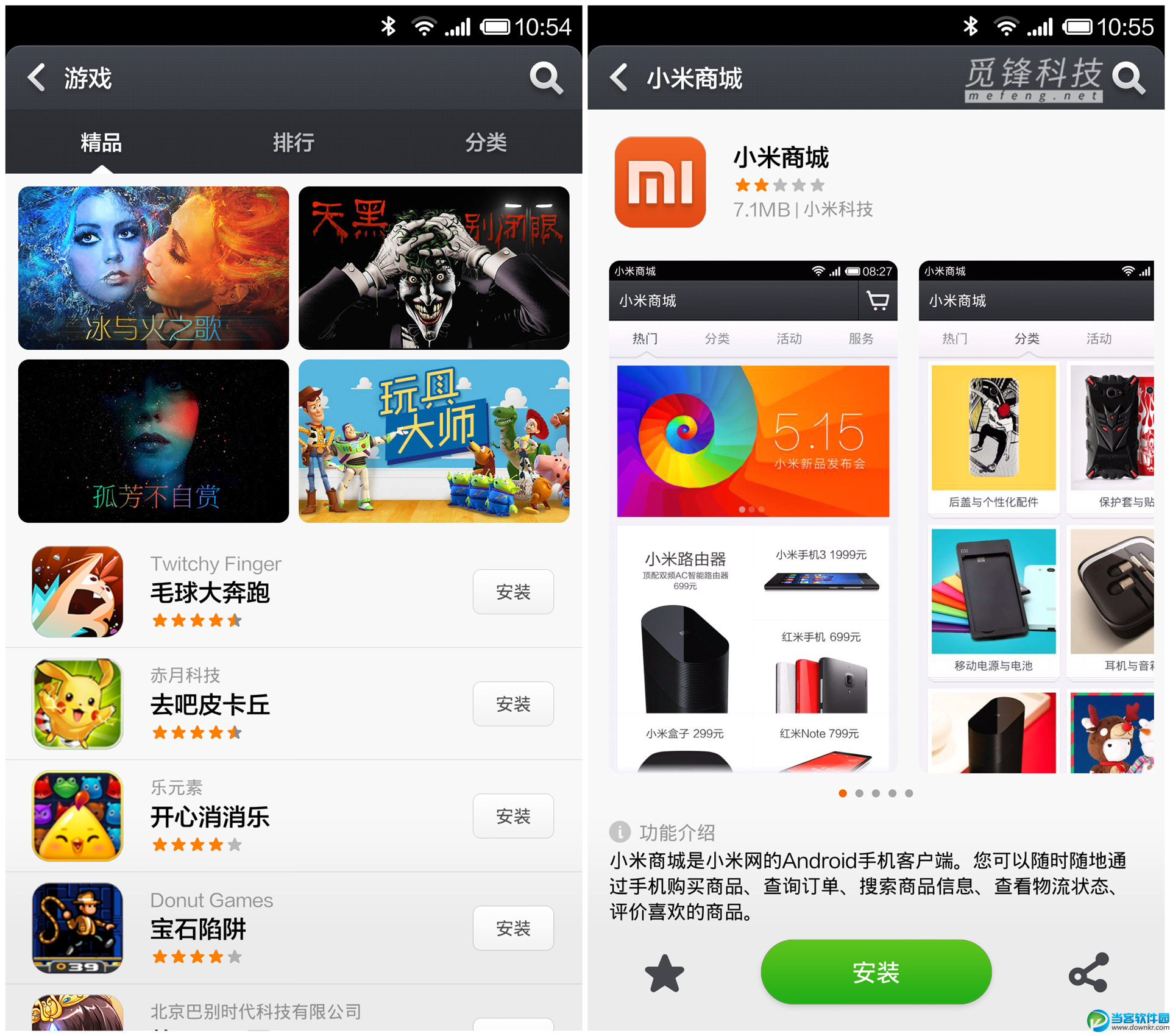 一个商城主打出售硬件,一个商店提供软件下载。也是像足了苹果的生态圈模式,当然其应用商店的规矩自然是没 App Store 严格,并且只提供免费的软件和游戏下载,唯一需要付费的就剩下所谓的开发者制作的小米主题,这一点可以说连魅族都不如,就不提其对应用开发者有多大帮助了。