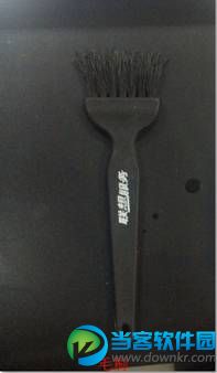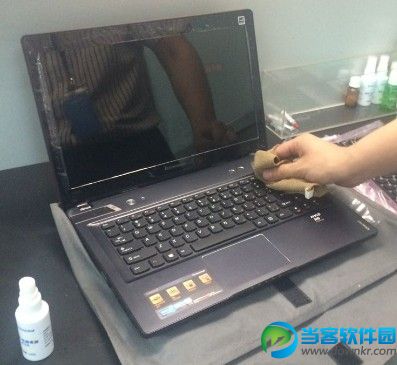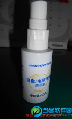4. 第四种方法是使用清洁液、皮吹、毛刷、清洁布进行清洁,使用皮吹,毛刷进行键盘缝隙大颗粒灰尘的清洁,然后把清洁液喷洒在清洁布上(切忌不可直接喷洒在键盘上)。使用清洁布擦拭键盘表面灰尘。如下图: