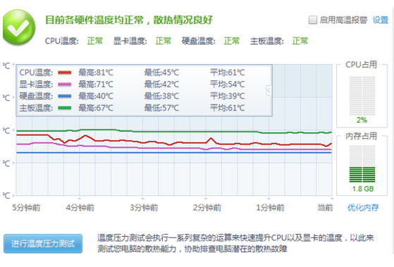 说法一:鲁大师的温度压力测试不需要你开任何应用程序的。你只需要点击鲁大师“温度检测”里的“进行温度压力测试”,然后它会弹出两个动态的窗口,你只需要看温度曲线的走向,如果有上70度的,那就高了,测个5分钟,都在70度下就正常!
