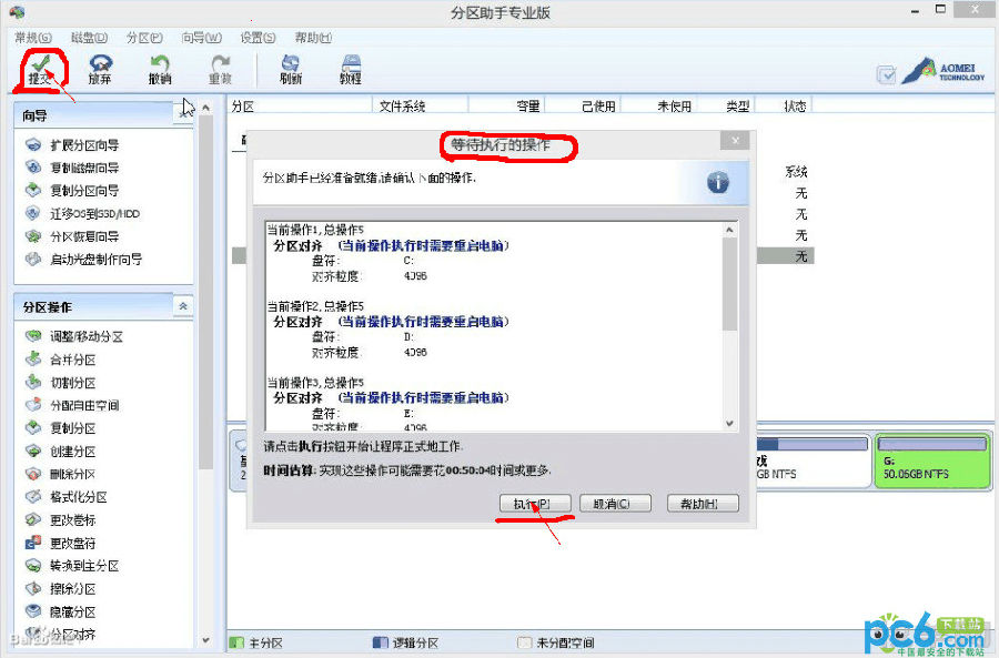 4、点击分区助手左上角“提交”出现(等待执行操作的对话窗口)。在点击“执行”即可。