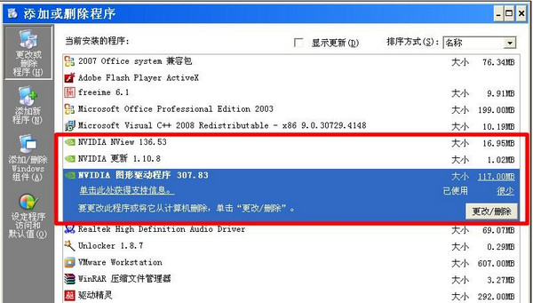 第二步:在安全模式的控制面板添加删除中把显卡驱动删除干净: