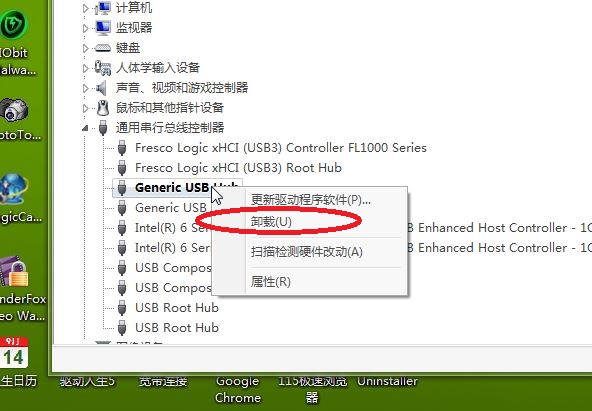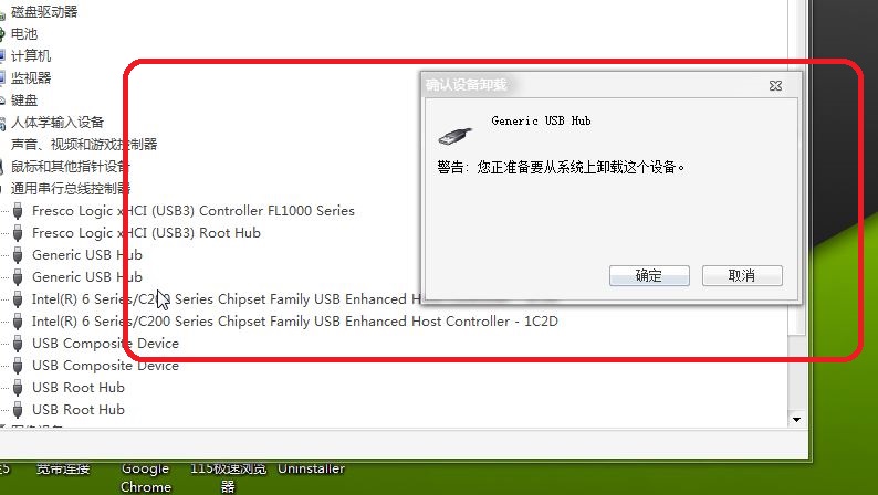可是我怎么能记住那名字呢?还是用我的土办法,挨个实验,逐个卸载,哪一个卸载之后,鼠标底板的红灯灭了,那个就是对应的USB接口了。
