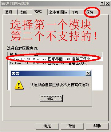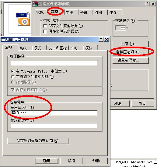 3 高级》自解压选项》常规》安装后运行 连接到 暗凶批处理文件 这里的作用是为了能 压解后自动运行