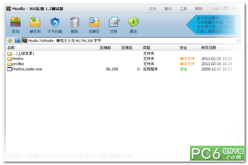 我安装完“360压缩”后,发现其界面比Winrar来说相对简单,多了一个木马扫描按钮引人注目,其默认使用ZIP压缩文件,也支持rar文件。