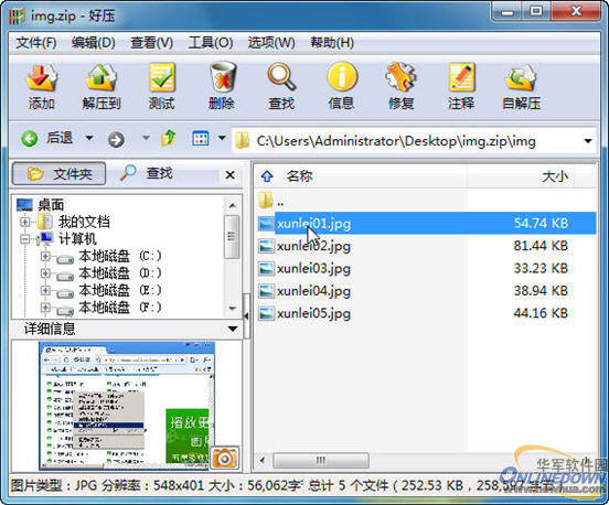 以前我们要对压缩包内的图片文件进行查看时,都需要先解压缩。好压省去了这个繁琐的步骤,它支持直接在压缩管理器中浏览压缩包内的图片。双击图片压缩包打开好压窗口,然后点击其中的一个图片文件,在左下角的详细信息窗口显示了该图片的缩略图: