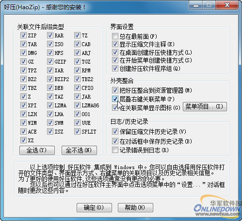 安装安装向导一次点击“下一步”即可,最后来到设置选项这一步,与WinRAR类似,我们在这里可以设置好压的各种参数: