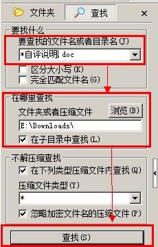 2.可以看到这里有“要找什么”和“在哪里查找”选项,由于这里我们只需要将文件名中包含“自评说明”字符的文件添加进来,因此可以在“要查找的文件名或者目录名”栏中键入“*自评说明*.doc”,然后选择下查找路径,勾选“在子目录中查找”,最后点击“查找”按钮(图2)。