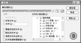 WinZip提供了对压缩包中的部分文件进行解压缩功能,使用时双击某一需解压文件所在的压缩包,随后弹出WinZip主界面(如图8),在该界面中选择需进行解压缩的文件或文件夹,如果要一次对多个文件或文件夹进行解压缩,单击“释放”按钮,在弹出的“释放”对话框选择好文件解压的路径单击“确定”即可进行解压缩(如图9)。