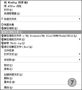 对于解压缩,WinZip也提供了简单的方法:在系统资源器中,使用鼠标右键单击压缩包文件,在系统右键菜单中包括了多种解压缩的方式(如图7),其中“解压缩到”表示自定义解压缩文件存放的路径和文件名称,“解压缩到这里”表示释放压缩包文件到当前路径,“解压缩文件到XXX\”表示在当前路径下创建与压缩包名字相同的文件夹,然后将压缩包文件扩展到这个路径下,“解压缩到文件夹”表示释放该压缩包文件到最近访问过的文件夹。可见无论使用哪个,都是很方便的。
