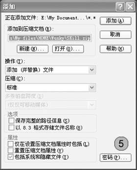 向某个压缩包添加文件时用鼠标右键单击需要添加的文件,在右键菜单中选择“添加到zip文件”命令,在随后弹出的“添加”对话框中(如图5)提供了多项设置。