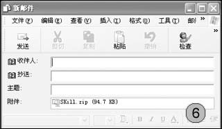 WinZip提供了一个非常体贴的邮件压缩功能,通过此项功能我们可以直接对需要邮寄的文件以压缩包的形式快速输送到邮件的附件中,方便以后邮寄。使用时我们在右键菜单中选择“压缩并邮件<文件名>.ZIP”命令,将要邮寄的文件压缩后随后会弹出一个“新邮件”窗口(如图6),在该窗口中我们再输入收件人地址和主题即可。
