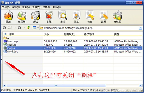 “好压”的界面与WinRAR很像,不过正可谓采众家之所长。除了能够像WinZip一样,提供“大图标”、“小图标”、“列表”、“详细信息”等多种文件显示模式外,还能在无需解压的情况下直接预览到压缩包图片。当然考虑到个别用户的使用习惯,“好压”同样允许我们点击“收缩”按钮关闭边栏,在这一点上还是相当值得称赞的。