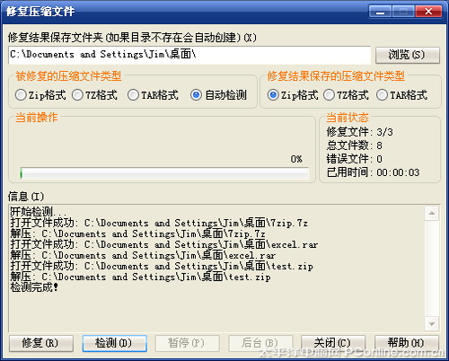 针对压缩文件容易遭破坏的问题,“好压”也提供了一项快速修复功能。使用时只需打开“好压”面板,选中已经遭受损坏的压缩文件,再来点击“工具”菜单→“修复压缩文件”,便可通过“修复”按钮启动修复。正如大家看到的那样,“文件修复”也能支持批处理操作,同时还可以将修复后的文件自动保存为统一格式,用起来十分方便。