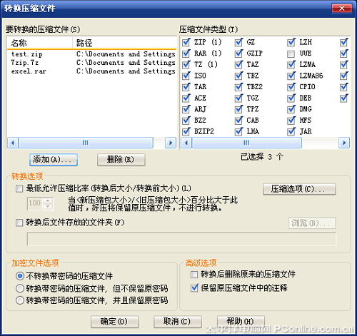 有时一些不太常见的压缩格式,往往会给交流双方带来麻烦。其实对于这种情况,我们完全可以通过“好压”的“格式转换”功能加以解决。具体方法很简单,首先进入“好压”界面,点击“工具”菜单→“转换压缩文件格式”,然后利用“添加”按钮将所有待处理的压缩文件添加进来(好压支持批处理模式)。接下来再点击“压缩选项”,设置好转换后的压缩包格式(允许转换为ZIP、7Z、TAR,默认为ZIP)。最后点击“确定”按钮,即可开始转换操作。