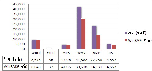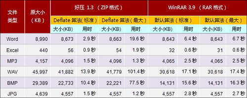 相信大家对“好压”的最大疑问,就是它的实际压/解压性能了。为了回答这个问题,笔者特意准备了一组常见格式测试包,共包含Word、Excel、MP3、WAV、BMP、JPG等六组文件。然后分别在默认算法(Deflate)下,对样本包执行了“标准”、“最大”两组压缩测试操作。为了能让数据更具对比性,这里还同时加入了WinRAR 3.9的测试结果。