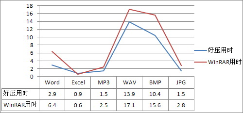 可以看到,在与知名压缩软件WinRAR的对比中,“好压”还是在“文件压缩比率”上占了下风。但令人欣慰的是,在参测的6种日常格式中,“好压”均以较大比例赢得了压缩用时上的胜利。此外如果仔细观察,您会发现WinRAR的优势其实并不平均,它的亮点主要体现在日常使用频率并不很高的“WAV”和“BMP”压缩上。可以得出结论,“好压”在日常压缩过程中,不但花费的时间更短,而且压缩率其实并不输于WinRAR。