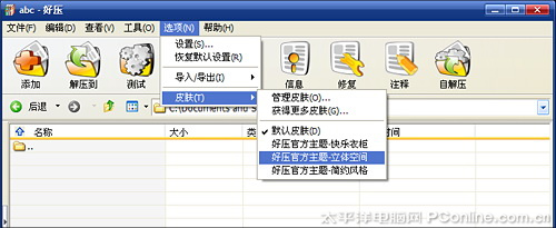 “好压”的界面并非一成不变,同样也能像WinRAR一样让我们选择不同的皮肤。操作时只要打开“选项菜单”→“皮肤”一项,即可自由挑选。同时我们也能通过点击“获得更多皮肤”,到官网去下载更多的皮肤。