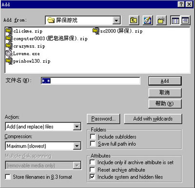 在资源管理器窗口中,使用鼠标右键单击需进行压缩的文件夹,在弹出的菜单中选择“Add to Zip”命令,程序会弹出“Add”对话框(如图5),可以进行压缩包的创建,也可以向压缩包中添加压缩文件的操作,如果选择“Add to Fileszip”菜单命令,程序可在文件当前目录下创建一个以该文件命名的压缩包。