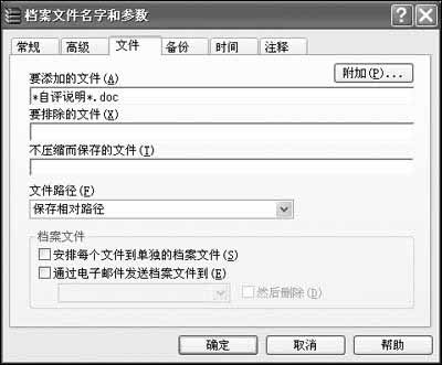 如图所示,可以看到这里有“要添加的文件”和“要排除的文件”两项设置,由于这里我们只需要将文件名中包含“自评说明”字符的文件添加进来,因此可以在“要添加的文件”栏中键入“*自评说明*.doc”,其余的设置不用更改。