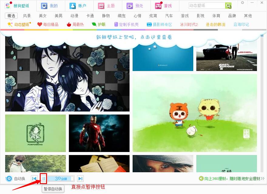 打开搜狗壁纸,默认是显示30分钟换一次,点击时间,在弹出的对话框中选择暂停自动更换。