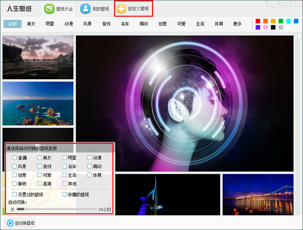 你还可以自定义设置桌面壁纸。点击左下角自动换壁纸,就可以自定义选择壁纸类别,并且选择自动切换的时间,那么在你自己不操作的情况下,就可以随时随心切换壁纸。如果你喜欢用自己拍的照片设置成桌面壁纸,你也可以点击自定义壁纸,添加电脑本地的照片来设置壁纸。人生壁纸会给你私人定制般的待遇。