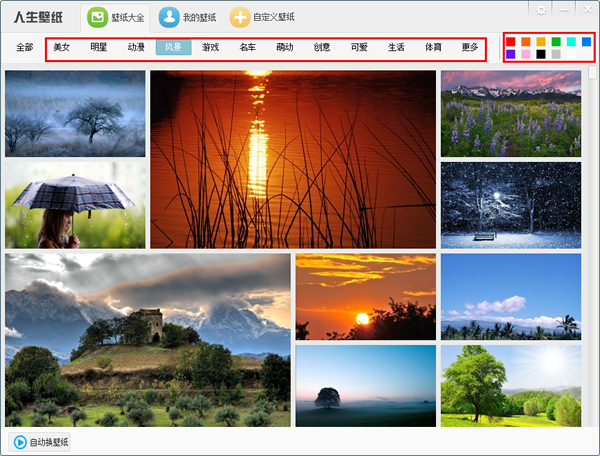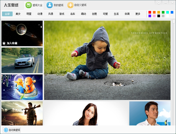 人生壁纸有十四类壁纸图片,有男童鞋会喜欢的动漫、游戏、名车等分类,也有女童鞋会中意的明星、萌动、可爱等分类。如果你是颜色控,你也可以点击右上角的颜色类别,选择自己最爱的颜色分类。