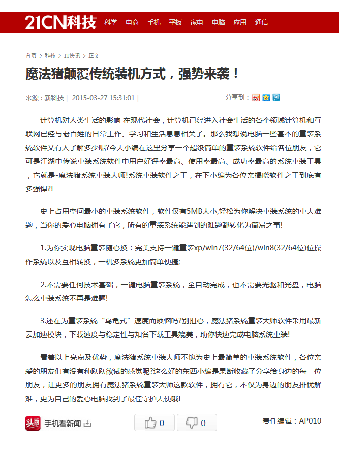 魔法猪是一款非常强悍的一键电脑系统重装工具,发布以来受到了众多IT行业媒体的关注。21CN作为中国十大门户之一,华南最大的门户网站也对魔法猪系统重装大师关注,可以看出魔法猪是多么的优秀和出色。下面是21CN相关报道的内容,欢迎大家点评哦!