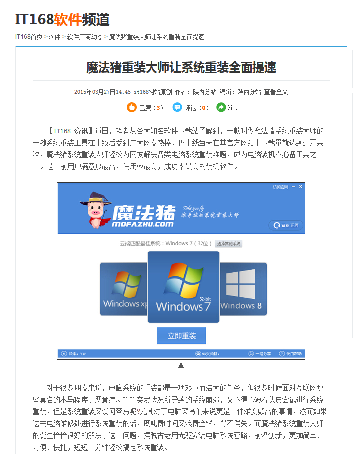 IT168是中国指导IT产品采购的知名媒体品牌,是国内最大、最权威的导购资讯网站之一。魔法猪系统重装大师也受到了IT168的关注,IT168对魔法猪一键系统重装大师做出了高度的评价和认可。下面是IT168新闻全文: