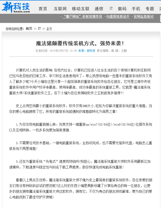 新科技是新兴的IT资讯和数码产品类网站,提供给力的PC和手机技术文章、丰富的系统应用资源。新科技对新的软件产品资讯非常敏感,魔法猪系统重装大师作为一款非常出色的一键系统重装工具,被新科技关注也是理所当然啦!下面是新科技报道全文: