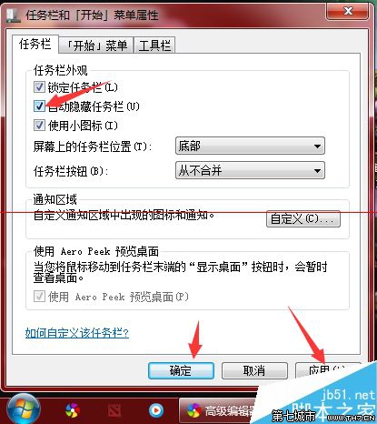 4、如果需要自动隐藏任务栏,勾选如图所示的“自动隐藏任务栏”,点“应用”和“确定”即可。