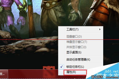 2、在任务栏上点击右键,在弹出的菜单中选择“属性”。
