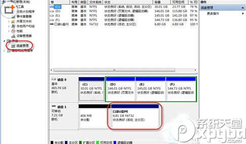 2.在计算机管理界面中选择磁盘管理,在这儿,我们可以很清楚的看到有一个“可移动”的磁盘。这个就是我们要找的U盘,细心的我们可以发现那个“可移动”的磁盘只是没有磁盘盘符号。当然,我们只要给U盘添加磁盘盘符号即可。