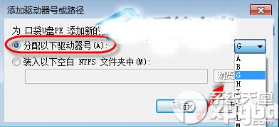 5.我们可以选择一个驱动器号给它,这个驱动器号就是我们接下来要给它分配的U盘盘符,在这里我们选择的G,选择完成后点击确定即可。