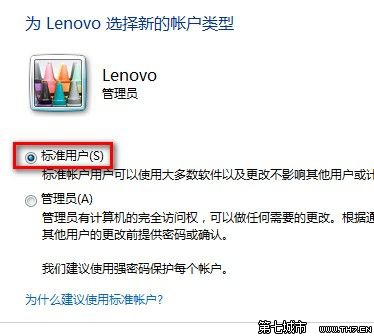 7,这时候账户“Lenovo“经变成修改好的“标准账户”。注意,如果被降级的账户是此计算机唯一一个管理员账户,则不能降低该账户权限。