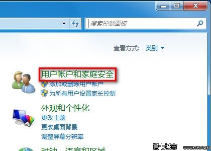 2,打开“控制面板”,点击“用户账户和家庭安全”。